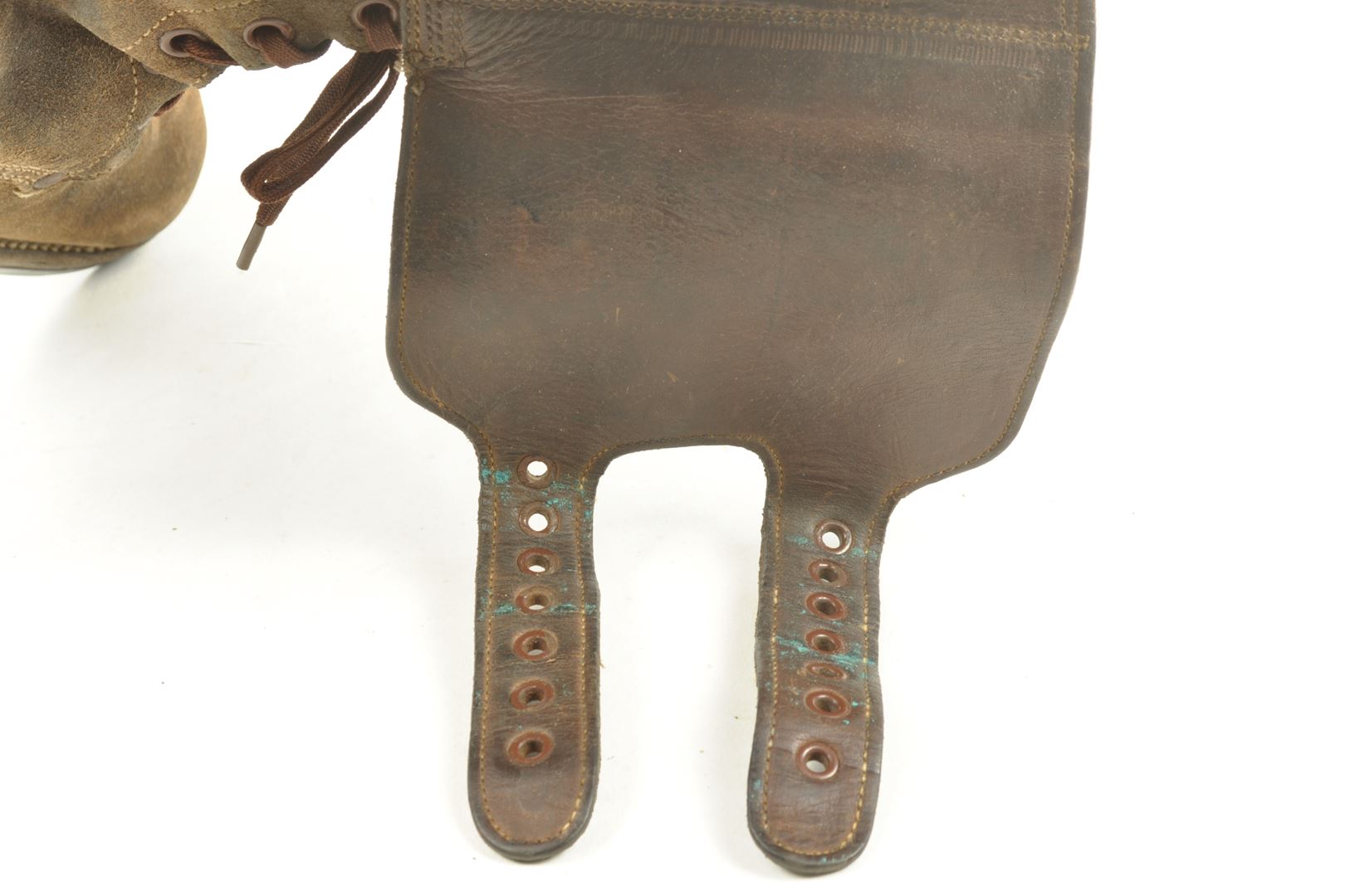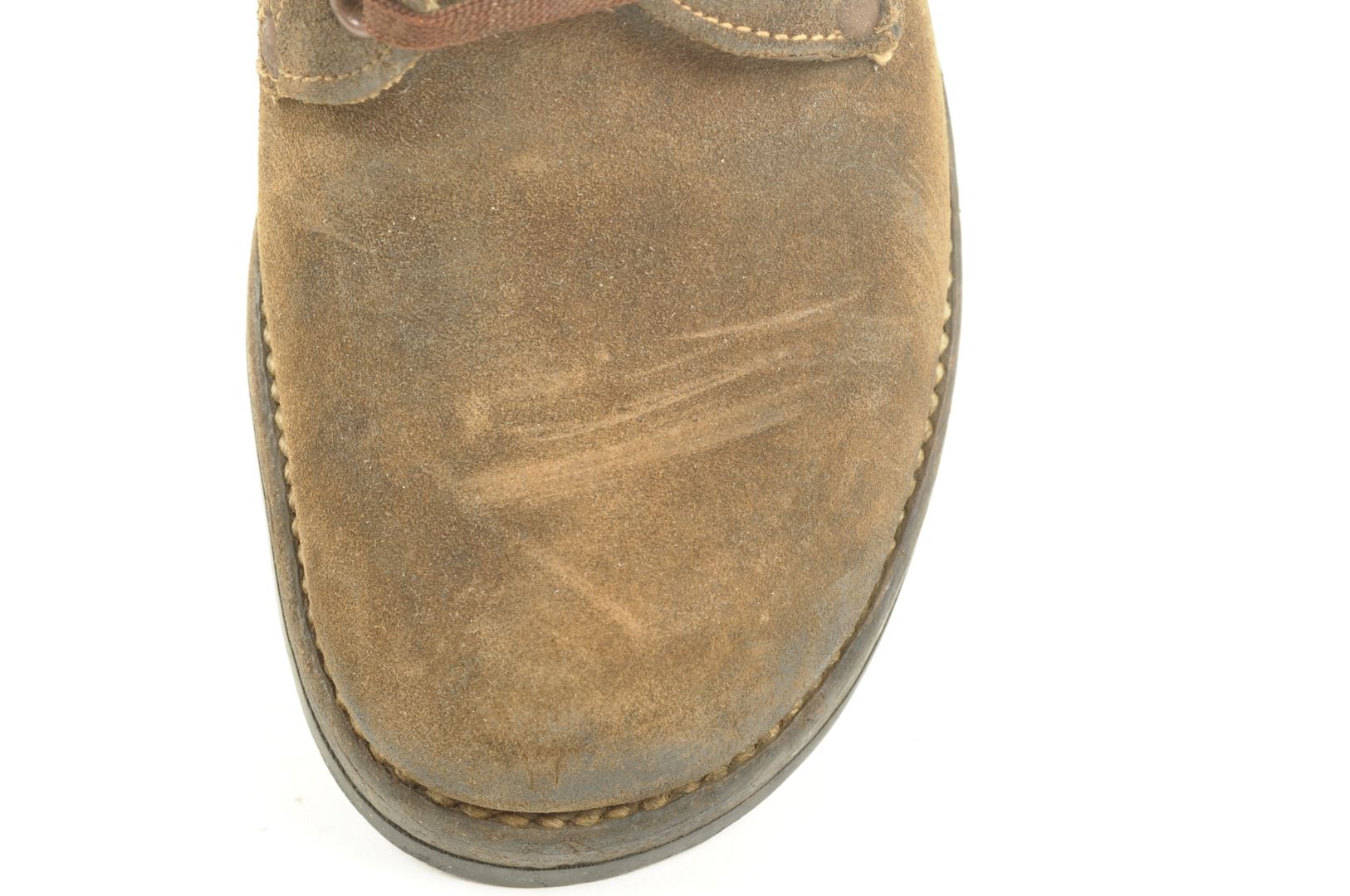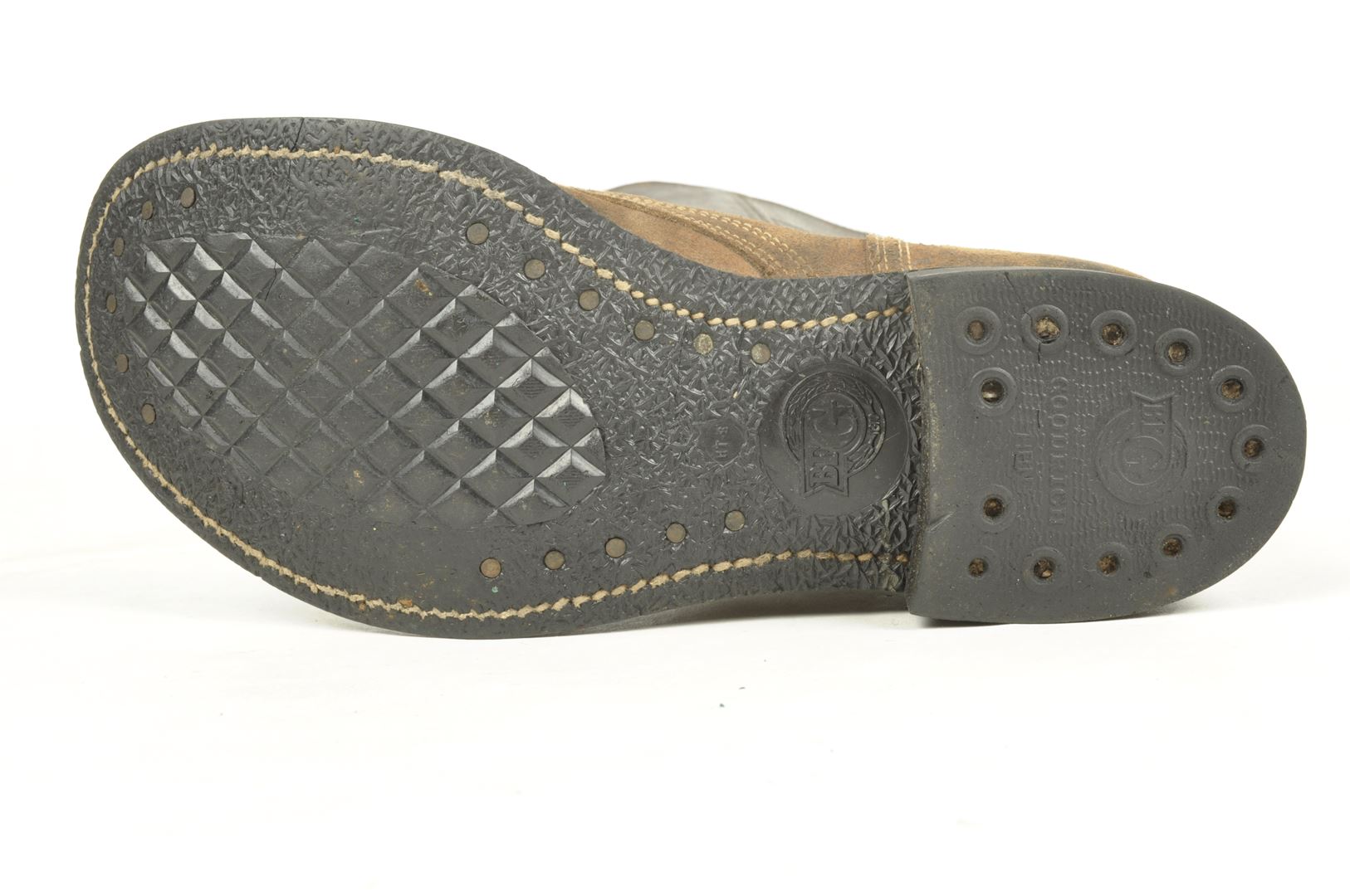Belle paire de brodequins en cuir retourné à jambières adoptés par l' US Army à la fin de l'année 1943 . Le cuir est souple , les coutures sont solides , doublure interne en toile de coton écru . A l'intérieur des jambières se trouve la pointure " 6 E N " ; Tampon du fabricant BROWN SHOE CO présent à l'intérieur de la jambière ou l'on peut encore lire l'année de fabrication : 1944 . Les lacets d'origine sont présents , les œillets possèdent encore leur peinture d'origine . Boucles fonctionnelles . Semelles d'origine en bon état général , non craquelées , portant encore les marquages du fabricant BFG . Paire en très bon état possédant une belle patine .